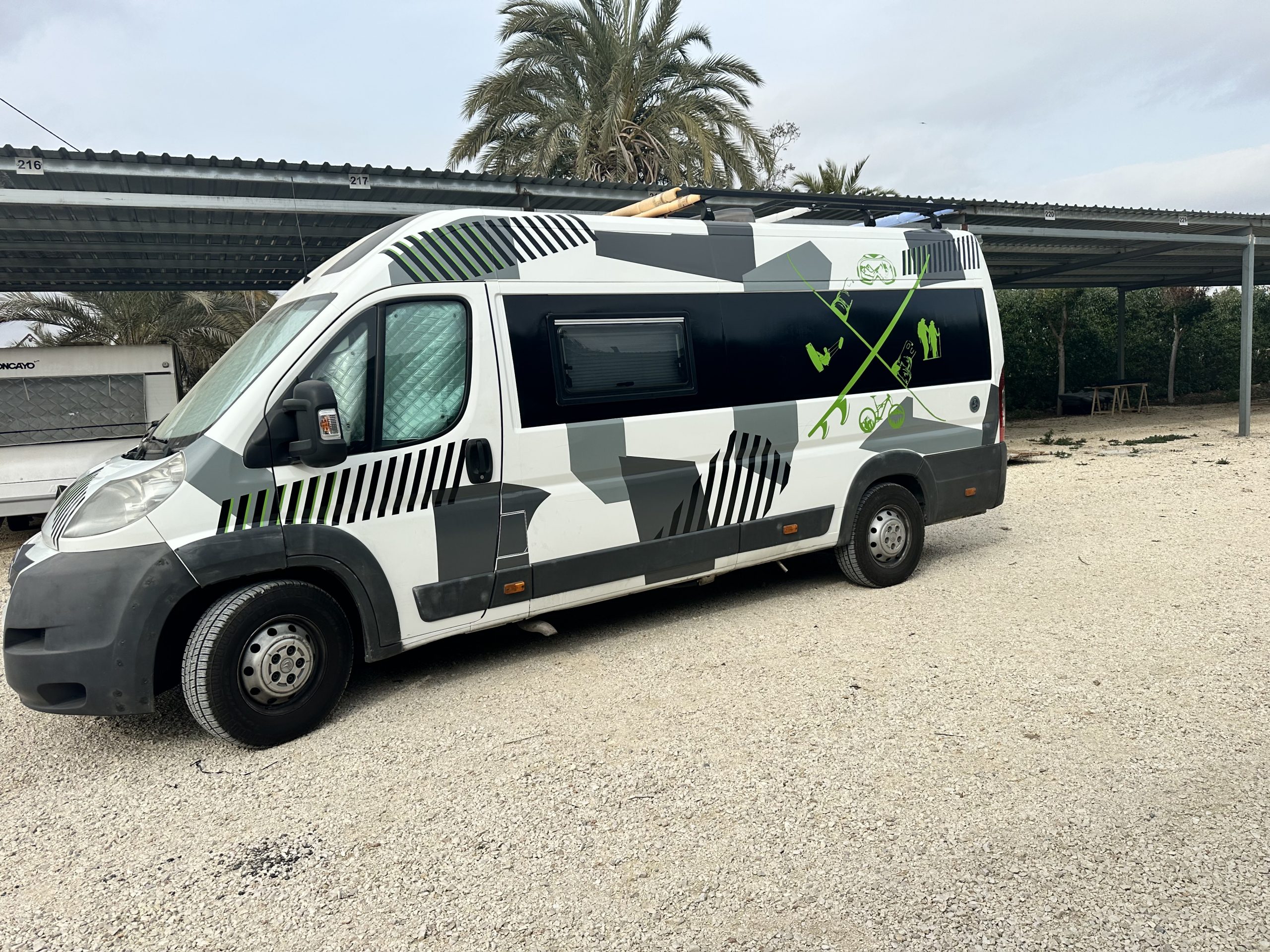 Vinilos precortados en 4 colores , gris oscuro, gris claro, tiras negras, tiras verde lima, Franja negra de 4m x 67cm para lateral. Dibujo en verde opcional (vinilos para los dos lados del vehículo) Vinilos de fácil instalación libre de burbujas